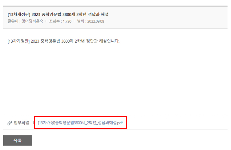 해당 글을 눌러보면 이렇게 업로드된 자료를 볼 수 있는데 첨부파일에 있는 pdf 형식의 파일을 눌러서 내려받으면 되겠습니다. 별도의 계정 가입이 필요하지 않아서 누구나 쉽게 받을 수 있는 것 같습니다. 해당 출판사의 교재를 많이 이용한다면 가입해도 괜찮겠죠.