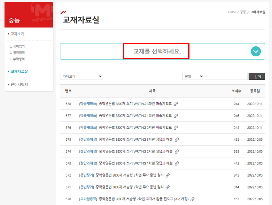 교재자료실로 들어오면 마더텅 출판사에서 나온 교재들에 대한 여러가지 학습에 도움이 되는 자료를 다운받아서 이용할 수 있게 되는데요. 직접 검색을 하셔도 되고 교재를 선택하세요 부분에 있는 메뉴를 눌러서 문제집의 이름을 찾아도 됩니다.